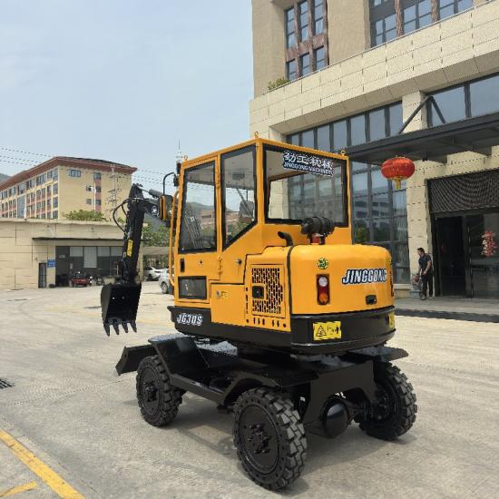 Khả năng cơ động: Bánh xe của máy xúc mini có khả năng cơ động cao, cho phép chúng hoạt động trong không gian chật hẹp và di chuyển xung quanh các chướng ngại vật.